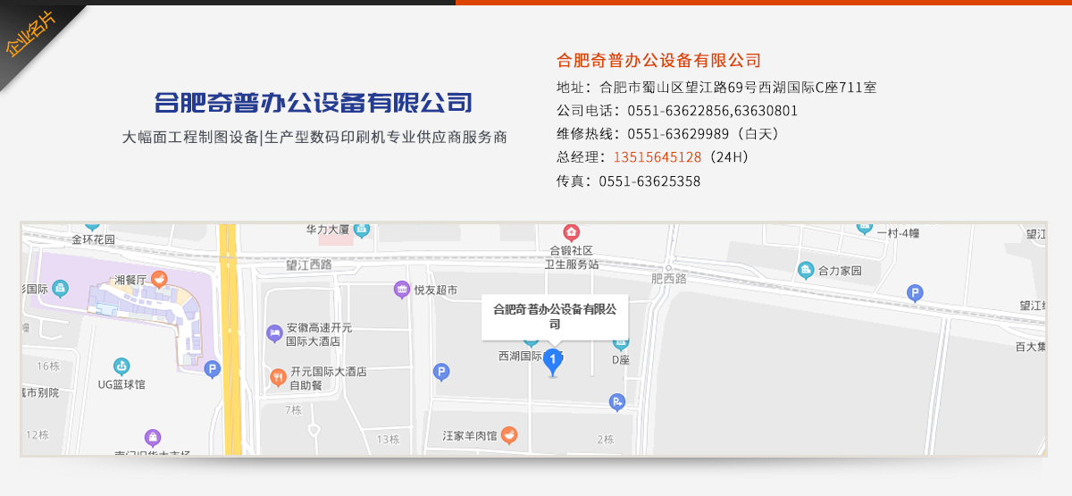 合肥奇普辦公設(shè)備有限公司是安徽省大幅面工程制圖設(shè)備和印刷設(shè)備專(zhuān)業(yè)供應(yīng)商和服務(wù)商,代理和質(zhì)保各種設(shè)備:大幅面高速機(jī)/繪圖儀,激光藍(lán)圖機(jī),生產(chǎn)型印刷機(jī),大幅面掃描儀等,以及上述設(shè)備的墨盒、墨水、配件、紙張等消耗材料。